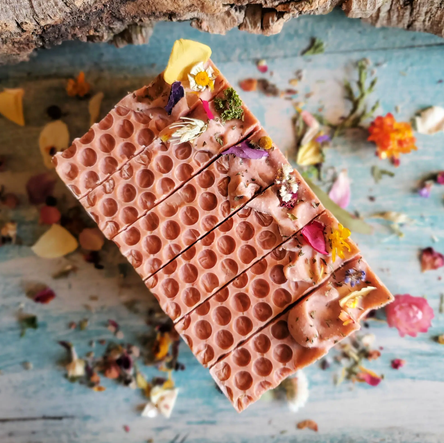 This soap is VEGAN! The honey scent is a fragrance oil. No actual honey is used in this bar. :) This bar is topped with individual dried flowers.