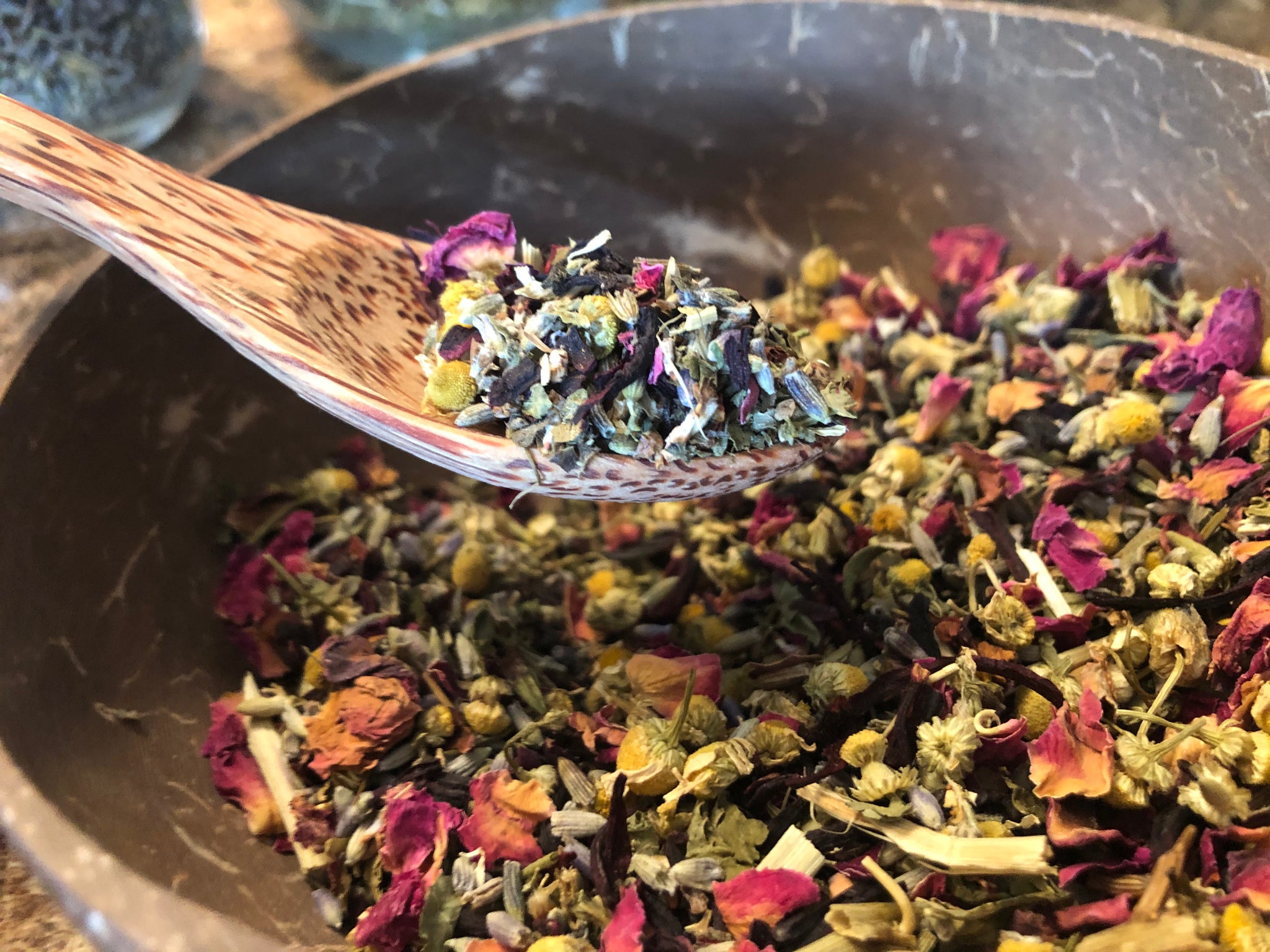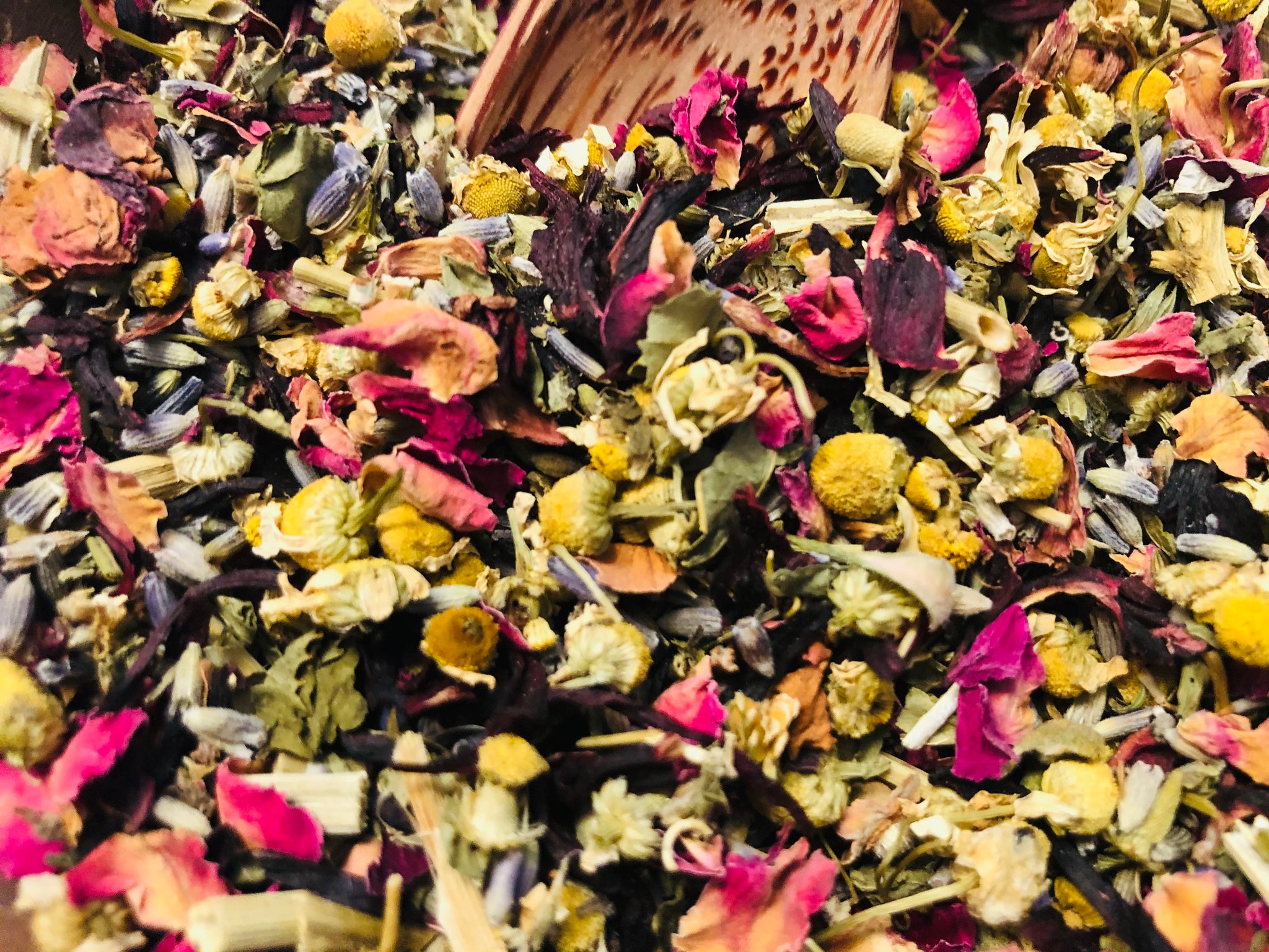 Ingredients: Chamomile, Lavender, valerian root, lemon balm, Passion flowers, ashwagandha, vervain, blue lotus, hibiscus, Rose petals, hops, lemon grass, orange peel